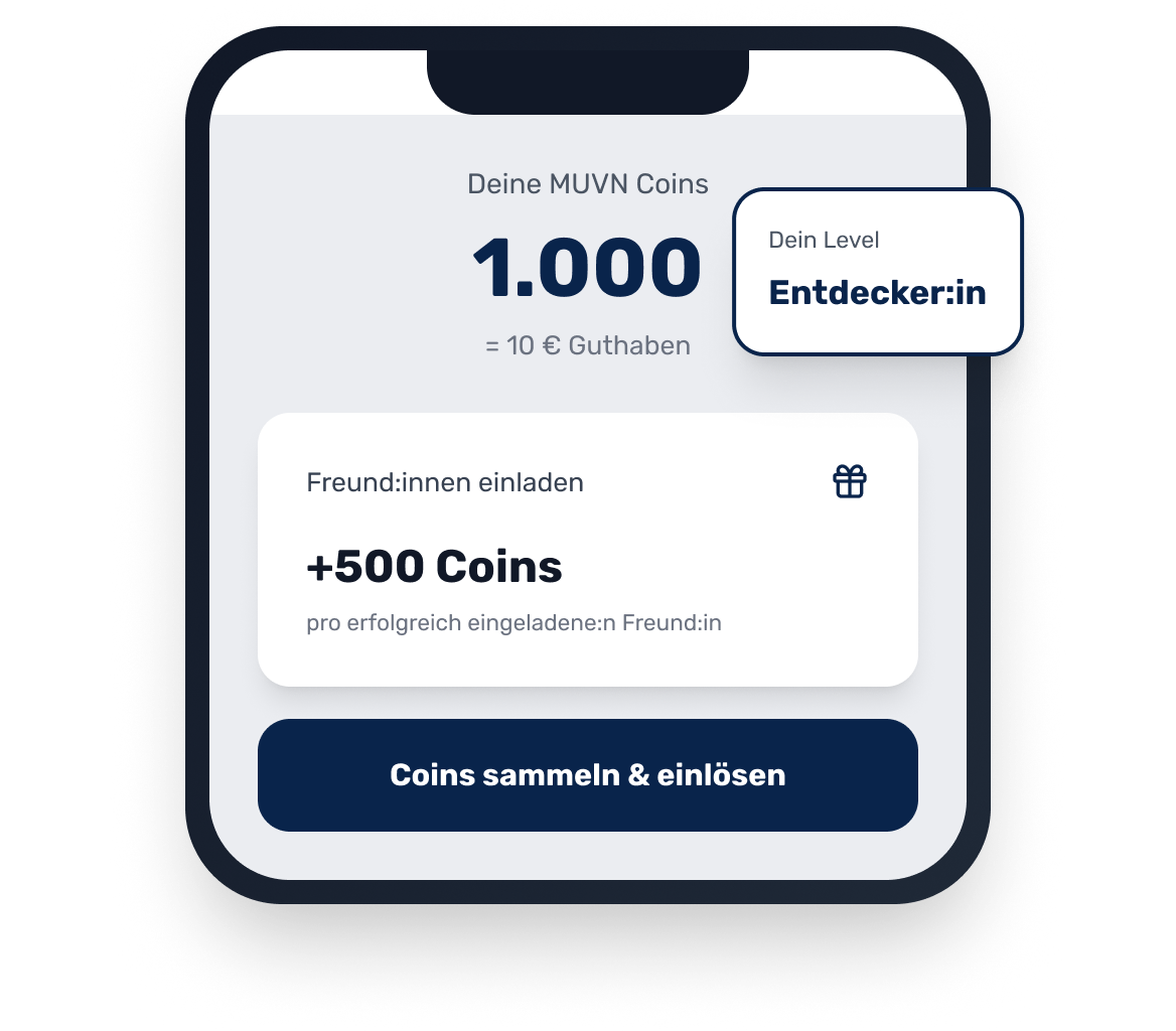 Für jedes empfohlene MUVN Match bekommst du 500 Coins = 5 € Rabatt für den nächsten Transport. Dein:e Freund:in ebenfalls.